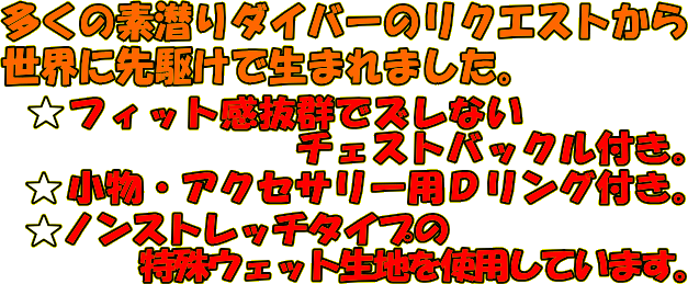 ウェットスーツのプラス浮力をウェイトベルトでニュートラルにするのですが、腰部分のみのベルトでは潜降スピードや水中での安定が得られず、ついついオーバーウェイトにして少々苦しい目にあいがちですが、このウェイトベストを使用すると、オーバーウェイトにしなくてもスムーズに潜降出来、水中での体勢も非常に安定します。無駄な力を使わず、息も乱れませんので、より水中滞在時間が長くなりおすすめする一品です。当社オリジナルのアイデアで使い易さも抜群です。 |