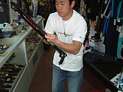 | 水中銃は、自然の中で使うものですから、陸上や水中でも、岩に当たったり、波にもまれたり、けっこうダメージがあります。 硬質アルミにラバーコートしたこの銃は、木製銃と違い、少々のことでは傷付きません。日常使いとしての銃の基本である道具として使い易さが、木に勝ります。 |
